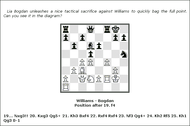Game InsertionThe main objective of the new magazine page is to be able to insert chess specific material, especially replayable games. For each game that you insert into your magazine, Palview will write a corresponding separate html file for the game. This game file will be called gN.htm where N is the number of the game (less one). This special game file is loaded by the new game viewer to be replayed. Note that this special game html file will only be written once during the processing of the magazine page -- the very first time the game is encountered. But it is possible to include the same game a number of times throughout the magazine (for instance, in a crosstable and in a separate link below it.) Once the gN.htm file has been written, the game is marked as written and the program will not write it again, but it will write any further links to this game if the game appears again in the magazine. The command to insert a replayable game is: <!-- palview game 1 --> You can insert multiple games by separating the game numbers with a comma, as in this example: <!-- palview game 1,2,3 --> All of the games are taken from the PGN file passed along with your magazine template Html file. Note that although the first game in the PGN file is number 1, the program will generate a separate game file called g0.htm for this game. And for game 2 in the PGN you'll get g1.htm, etc. This is just something to keep in mind, but all you really need to remember is that the first game in the PGN file is number 1. This is the number you need to place in the game insertion command. It is illegal to insert an empty game into the magazine. It is perfectly OK, however, to include empty games in the magazine's PGN file to allow proper crosstables to be inserted -- but don't try to insert an empty game! This will generate an error. One other point to take note of is that diagrams are suppressed in the magazine's replayable games. You can include a diagram marker in any PGN game, but it will be ignored. Game links are written to the magazine file as an Html Unordered List with a CSS class called gm. <UL class='gm'> <LI> game link <LI> ... </UL> The actual game link, say for game 1, is written as: <A HREF='javascript:Gm(0)' TITLE="openingtooltip">player info game info</A> The openingtooltip above is determined by the INI option: tooltipopening. If tooltipopening is set to off, then no tooltip is written at all. An example of an opening tooltip is: TITLE="QGD : Anglo-Tarrasch : Bogolyubov Variation" The player info is written as: White Title (Elo) - Black Title (Elo) with the values taken from the appropriate PGN Tags for the game. The formatting of the player's names themselves is controlled by the INI option: namepattern. An example of the player info is: Korchnoi V. GM - Kasparov G. GM The game info is written as: result (moves) [ECO] rN Event, Site Date. You can select how much of this information you want using the new INI option: gamelinkinfo. An example of the game info is: 0-1 (77) [D34] r6 Candidates Match2 Putting it altogether, we might end up with something like: <UL class='gm'> <LI><A HREF='javascript:Gm(1)' TITLE="QGD : Anglo-Tarrasch : Bogolyubov Variation"> Korchnoi V. GM - Kasparov G. GM 0-1 (77) [D34] r6 Candidates Match2</A> </UL> A complete description of the CSS for the game link can be found in the section, CSS for Inserted Game Links. Static Game InsertionIt may sometimes be useful to insert a static game directly into your magazine. One reason why you might want to do this is to use a game fragment as a visual teaser to entice a viewer to click on the link to a complete, replayble version of the same game. The command to insert a static game is: <!-- palview static 1 --> In the example below, you can see that a game fragment of the Williams - Bogdan game has been inserted as a static game. After the game, you see the two links to games by Bogdan, the first of which is the same game, but complete and replayable. ![]() ![]() The above was accomplished by first creating a fragment of the original Williams - Bogdan game and appending it to the end of the PGN file. Notice in the PGN game example below that we have used a FEN Tag to supply the position after White's 19th move. All the actual moves before Black's 19th have been deleted. We have used the special Intro comment to supply our teaser text and we have added a Diagram Marker immediately after this Intro comment to get Palview to generate a diagram of the position. A board caption has also been provided. (Note that diagrams that appear in the magazine from inserted static games may be active if avtivemag is set. For more details, see avtivemag.) [White "Williams, Paul"] [Black "Bogdan, Lia"] [Event "Remembrance Day Open"] [Site "Toronto, CAN"] [Date "1983.??.??"] [Round "?"] [Result "0-1"] [FEN "r2q1rk1/p1p3pp/1p1bp3/3p3n/2PP1P2/1PB3P1/P1QNPRK1/R7 b - - 0 19"] [SetUp "1"] [WhiteCountry "CAN"] [BlackCountry "CAN"] {Lia Bogdan unleashes a nice tactical sacrifice against Williams to quickly bag the full point. Can you see it in the diagram?} {#[Williams - Bogdan<BR>Position after 19. f4]} 19... Nxg3!! 20. Kxg3 Qg5+ 21. Kh3 Bxf4 22. Rxf4 Rxf4 23. Nf3 Qg4+ 24. Kh2 Rf5 25. Kh1 Qg3 0-1 The next step was to insert it into the magazine using the following in our template Html: <!-- palview command pgnheader = off --> <!-- palview static 25 --> <!-- palview command pgnheader = on --> <BR> <!-- palview game 7,8 --> Note in the above example that we use the new command to turn off the INI option pgnheader so that no gameinfobox is created. (More about the new command later on in this section.) We then insert the static game fragment and turn on our pgnheader again. After a simple Html <BR>, we insert the two replayable games, the first of which is the same game as that which we inserted as a static game, although it is complete. One thing to note about static games: Static games are not included in either index when the index is created from the maga