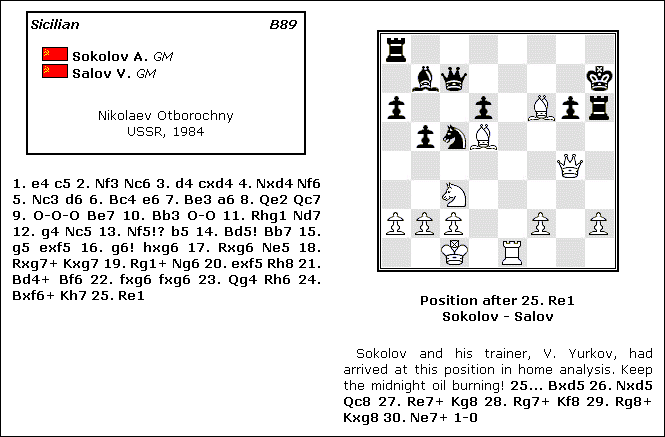 It is also possible to have your inserted static game use two columns. You can insert a column break into the PGN game where you would like the break to occur. The column break is inserted into the game as a special PGN Command Extension within a comment: {[%palview colbreak]} Here is an example PGN game: [White "Sokolov, Andrei"] [Black "Salov, Valerii"] [Event "Nikolaev Otborochny"] [Site "USSR"] [Date "1984.??.??"] [Round "?"] [Result "1-0"] [WhiteTitle "GM"] [BlackTitle "GM"] [WhiteCountry "USSR"] [BlackCountry "USSR"] 1. e4 c5 2. Nf3 Nc6 3. d4 cxd4 4. Nxd4 Nf6 5. Nc3 d6 6. Bc4 e6 7. Be3 a6 8. Qe2 Qc7 9. O-O-O Be7 10. Bb3 O-O 11. Rhg1 Nd7 12. g4 Nc5 13. Nf5!? b5 14. Bd5! Bb7 15. g5 exf5 16. g6! hxg6 17. Rxg6 Ne5 18. Rxg7+ Kxg7 19. Rg1+ Ng6 20. exf5 Rh8 21. Bd4+ Bf6 22. fxg6 fxg6 23. Qg4 Rh6 24. Bxf6+ Kh7 25. Re1 {[%palview colbreak]} {#[Position after 25. Re1<BR>Sokolov - Salov]} {Sokolov and his trainer, V. Yurkov, had arrived at this position in home analysis. Keep the midnight oil burning!} 25... Bxd5 26. Nxd5 Qc8 27. Re7+ Kg8 28. Rg7+ Kf8 29. Rg8+ Kxg8 30. Ne7+ 1-0 And here is the resulting inserted static game: ![]() Crosstable InsertionCrosstables can also be inserted into your magazine, provided that all the games for the event are included in the PGN file. The command to insert a crosstable is: <!-- palview cross "event-name" --> The event name must match the PGN Tag [Event "event-name"] exactly and this is true for every game in the event. All the games from the event must be in the PGN file. Palview needs to know all the results of all the games from an event in order to create a correct crosstable. Some of these games can be empty games if you just need to fill out the missing games to complete the event. In this case, only the result from the empty games will be included in the crosstable but no links will be generated to these games. This can be useful if you want to generate a complete and accurate crosstable for an event, but you only want to include a selection of the games for your magazine. Here is an example of an empty game. Note that there are no moves or commentary after the tags, only the game result. [White "Smyslov, Vassily"] [Black "Ribli, Zoltan"] [Event "Candidates Match"] [Site "London, England"] [Date "1984.??.??"] [Round "11"] [Result "1/2-1/2"] 1/2-1/2 If you wish to have the resulting crosstable link to the games, you must remember to set the crosslink INI option to on. Below is an example of an inserted crosstable for a Match: ![]() Palview always writes an anchor before the crosstable itself that can be used as a target for an internal link, say from a Table of Contents. This anchor always contains the name of the event itself as in this example: <A NAME='pcross_Dortmund'></A> ... the crosstable appears here All the CSS for the inserted crosstable is the same as for previous Palview generated crosstables. For more information about the CSS, please see CSS for the Crosstables. For information about the various INI options that affect crosstables, please see Crosstable Basics. For more information about Palview4 and crosstables, please see Crosstables and Tournament Coverage. Note that inserted crosstables are useful if you wish to link from the tables directly to any, or some, of the games from the event to the new game viewer. If, on the other hand, you just wish to have the Html of a crosstable, without using the games, you may wish to use the new Palview Utility program to create such a table. You can insert the Html created by the Utility program directly into your magazine using the new file insertion command to be discussed further below. Diagram InsertionDiagrams can easily be inserted into your magazine using the new diagram insertion command. The diagrams that are inserted can even be active in that visitors to your page will be able to move the pieces around on the board, provided that you use the INI option activemag. When activemag is set to on, Palview will generate a special JavaScript file named after the magazine that will be linked to by the magazine's Htm file. This special JS file contains the code required to move the pieces around on the board. It is also possible to take back any moves you make on the board as well. (See activemag for more detail.) Of course, if you decide not to use active diagrams, then the boards will be static in that you cannot move the pieces around on them. The actual board image to be used in the diagrams in set by the INI option boardimage. Note that it is especially useful to name your board image after the size of the pieces you expect to use (set by the new INI option magdiagramsize). If you use such a naming convention for the board image, then Palview will be able to determine the correct board image to use if you decide to change the size of the pieces for other diagrams within your magazine. (More on this below.) In general, the command appears as follows, where operands within the square brackets are optional: <!-- palview diagram [size=N] [flip] FEN[:caption] --> The program will use the current value of magdiagramsize to create a diagram. But you can override this value temporarily by adding a size= operand in your diagram insertion command. For example, you can have a diagram inserted using the 24 pixel pieces by writing: <!-- palview diagram size=24 ... --> Note that this will not affect the value of magdiagramsize so that the very next diagram will again use its value. You can also choose to flip a diagram so that the Black pieces appear on the bottom of the board instead of the top. (To give a Black perspective on a given position.) To do this, you just insert the word flip just before the FEN itself (or after the size= if one is used.) An example might be: <!-- palview diagram size=24 flip --> Finally, the actual diagram position itself is provided as a FEN followed by an optional caption. The FEN does not have to be complete -- only the position part is needed (not the game state variabl