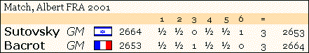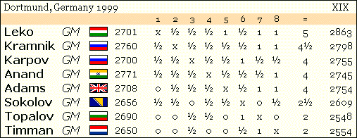 The Palview Utility ProgramOne of the more difficult tasks for a web-based chess magazine is the creation of crosstables. Palview has a number of options that allow you to create crosstables from the games in a PGN file. But sometimes you just want to report the results of a tournament without having to put together all the games in a PGN file and get Palview to create a fully linked table. Sometimes you just want a picture of the crosstable. But creating the Html for such a table is really a boring and mechanical task -- something best suited for a program. This is why the new Palview Utility program was created. You pass the Utility program a simple text file containing a simplified text version of your crosstable(s). You can also pass it an INI file along with the text file. The INI file will be read in order to obtain the settings for the INI commands: flags, flagurl, and crosstablecss, all of which are used by the Utility program to create an Html file that can be inserted (or copy / pasted) into your own Html files. You should also note that all the CSS properties that apply to Palview's usual crosstables also apply to the crosstables created by the new Utility program. For more information on crosstables and CSS, please see Crosstables and CSS. The new Utility program reads a simple text file and outputs an Html file. The text file contains a simplified text version of your crosstable. The first line must contain the keyword cross. This is required in order to tell the program what kind of transformation you want. In this case, you want to create a crosstable. (We may add other transformations to the program in the future to assist webmasters.) After the cross keyword you need to tell the program the number of columns in your crosstable using cols=N. You can also optionally provide a Category for your crosstable using the command cat=N. The second line of your crosstable text is for the heading. Here you would typically include the name of the Event, the Site and the Date. The Utility program will look for the first comma in the line and use all the text before it to form an Html anchor that it writes just before the crosstable. For example, if the heading line of your crosstable was: Match, Albert FRA 2001 Then the Utility program would write the following Html before the crosstable: <A NAME='pcross_Match'></A> The next line is for the Round numbers and the Totals columns. You can see an example of this below. All subsequent lines are for the player's and their results in the tournament. Below is the simplified text for a match and the Html created by the program from it. cross cols=15 Match, Albert FRA 2001 | | | | | 1 2 3 4 5 6 | = | | Sutovsky GM ISR 2664 | ½ ½ 0 ½ ½ 1 | 3 | 2653 Bacrot GM FRA 2653 | ½ ½ 1 ½ ½ 0 | 3 | 2664 ![]() The Palview Utility program reserves a few characters for special use in creating the simplified text for your crosstables. The pipe character '|' is reserved as a special empty column marker. Whenever the program encounters this, it will generate a simple empty column using: <TD> </TD>. Notice that all empty space between column contents is ignored. Because you will sometimes have column contents that has embedded spaces, the Utility program reserves the characters '{' and '}' to surround any contents with embedded spaces. An example might be a player's full name, as in: {Kasparov, Garry} GM RUS ... The Utility program treats certain column content as special. For example, the first column of every player row is assumed to contain the name of the player. In this case, the program will apply the special CSS class pplay to the name. For example: <TD class='pplay'>Kasparov</TD> (NOTE: This first column can optionally be a number instead, in which case the player name class, pplay will not be used and the next column will be examined for a player name.) Following the player's name, the program will examine the next few columns for a player's Title, Country, and Elo. The Utility program recognizes the following Titles: IM, FM, GM, WM, WG, M, CC-GM, CC-SIM, CC-LGM, CC-LM If the program recognizes a Title it will apply the special CSS class ptitle as in this example: <TD class='ptitle'>GM</TD> The Utility program also looks for any three-letter Country code within the first three columns after a player's name. If such a code is found, the program may convert this code to a country flag image. (As can be seen in the example images.) Whether or not flag images are to be used is determined by the INI setting: flags. If the program is to use the flags, then it will use the value provided by the INI option flagurl to determine where the flag images are kept. (For more information on Countries and their codes, please see The Palview Flags.) Finally, any numeric value between 1000 and 3000 that appears within the first three columns after a player's name is treated by the program as an Elo rating. The program will apply the special CSS class, pelo, to such a rating, as in this example: <TD class='pelo'>2845</TD> All other column content is inserted directly into the table as is without any special CSS classes applied. One final note. When a Category is provided, using the cat=N option, the program will write the Category number in Roman numerals at the end of the Heading row. For example, here is the simplified text for such a crosstable: cross cols=17 cat=19 Dortmund, Germany 1999 | | | | | 1 2 3 4 5 6 7 8 | = | | Leko GM HUN 2701 | x ½ ½ ½ 1 ½ 1 1 | 5 | 2863 Kramnik GM RUS 2760 | ½ x ½ ½ ½ ½ 1 1 | 4½ | 2798 Karpov GM RUS 2700 | ½ ½ x ½ ½ 1 ½ ½ | 4 | 2755 Anand GM IND 2771 | ½ ½ ½ x ½ ½ ½ 1 | 4 | 2745 Adams GM ENG 2708 | 0 ½ ½ ½ x ½ 1 1 | 4 | 2754 Sokolov GM BIH 2656 | ½ ½ 0 ½ ½ x 0 ½ | 2½ | 2609 Topalov GM BUL 2690 | 0 0 ½ ½ 0 1 x 0 | 2 | 2548 Timman GM NED 2650 | 0 0 ½ 0 0 ½ 1 x | 2 | 2554 Below is an example of the above crosstable converted by the Utility program. ![]() We may eventually find other tabular type infor