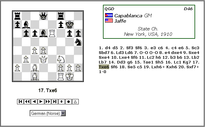 The multilang command is used to provide a drop down SELECT box under the controlpanel that will allow your visitors to your page to dynamically select the language of their choice for viewing the moves of the game. This feature is only supported by Internet Explorer 4+ and users of other browsers will not see the SELECT box (it is hidden from them). In this first example you can see the page as it would normally appear using the English language. ![]() Here is the same page after choosing German from the SELECT box. Notice that all the moves of the game have be rewritten using the German piece letters. The move under the board in the board caption is also rewritten. ![]() This final example is only available with multilang = extended. In this mode, Palview3 will add the additional support of the excellent Alpine figurine fonts. In this example the Linares Figurine font was selected. ![]() The multilang feature was added for the use of international chess sites for displaying mostly blank, or unannotated games (as in the above examples). It should prove to be a nice feature for new games that are shown on a daily basis but without annotations. If you have commentary added to the game, Palview3 will not be able to read any moves in the comments dynamically and change them. This is the reason why we recommend this feature for unannotated games only. The special option of multilang = extended, that allows the use of figurines, can only be taken advantage of by those visitors to your page that have one of the fine Alpine Figurine fonts installed on his computer. Other viewers of the page will only see the English piece letters if they select any of the Alpine Figurine fonts form the SELECT list. Palview3 will attempt to set the starting language of the SELECT based upon the pcletters that you have set. For example, the English piece letters, "PNBRQK", will make Palview3 start with English in the SELECT. But "BSLTDK" will force Palview3 to start the SELECT with German. One final note of caution. Do not attempt to use this feature with Live game broadcast! Each time the page is reloaded the language setting will be lost. This will cause undue consternation to your visitors. It may be possible at some point to make it possible to use this feature for Live broadcasts, but for now we recommend you use the default pcletters setting for the English piece names. For more information on using the Alpine Figurine fonts with Palview3, see Palview3 and Figurines. We would like to thank Alpine for their great collection of chess fonts which we have supported in Palview3. For more information on these fine fonts and how to obtain them, please visit their site at Alpine. |