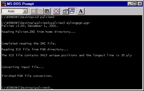 IntroductionPalview3 is a Win32 Console program for Windows. It is used to create Html with JavaScript for replaying chess games. The easiest way to use the program is to use Eric Bentzen's excellent GUI program, PalMate, written specifically to work with Palview3. But this manual will explain how to use Palview3 by itself, without reference to another program. To learn how to use Eric's PalMate program, please consult his documentation. While we highly recommended that you use Eric's PalMate program, please read this manual thoroughly, as it will explain all you need to know about the features that Palview3 offers and how to use them. The actual chess games that Palview3 will convert are read from a PGN file. PGN is Portable Game Notation. This file is a simple text file with the .PGN extension and its creation was the work of the chess newsgroup(s) and Steven Edwards. Your own chess software will allow you to create games and export them to a PGN file. (Consult your software's manual on how to do this.) You can obtain a copy of the PGN Standard here: PGN Standard . For more information on Palview3 and PGN, please read the section, Palview3 and Portable Game Notation PGN. Once you have a game, or a collection of games, in a PGN file, you can get Palview3 to generate an Html-JavaScript page for you. But just what kind of page, with what features, would you like? You determine these options through the use of another file with the extension, INI. This is another simple text file that contains a number of lines that set the various options that are available with Palview3. For now just accept that you can edit this INI file to change the settings. It is very easy, really. The many options that are available with Palview3 will be explained in more detail in the section The Palview3 INI File. They will also be discussed in various sections where they are of importance to the topic at hand. Once you have created an INI file that contains the settings for the various options that you want, you are ready to get Palview3 to create the Html-JavaScript page for you. You do this by passing, or sending, the PGN and INI files to Palview3. You can do this in a number of ways, but the safest is to use the Windows Console. Under Win95, Win98, and WinMe, the Console is also called the MSDOS Prompt. Under WinNT and Win2000, the Console is a program called CMD.EXE. Essentially what you do is start either of these two programs and then switch to the directory, or folder, that contains your Palview3 program. If we assume that you installed Palview3 on your desktop, then you would type cd desktop\palview3. This sets the current working directory to the palview3 folder on your desktop. Now you need to type the name of the Palview3 program, followed by the name of the PGN file. You would type something like: palview3 filename.pgn. All you have to do at this point is hit the ENTER key to start the program. Once the program is finished, you can hit the ENTER key again. Finally, you can type exit and hit ENTER to close the Console Window. Here is a picture of what all this would look like: ![]() The reason why using the Windows Console is the safest way to use Palview3 by itself has to do with the way longfilenames are treated under the various Windows OS. The Console method is the best way of preserving your longfilenames under every OS. Other methods of passing the PGN file to Palview3 are likely to result in shortened filenames. Mind you, the very best advice is to simply use short filenames at all times. Any filename of eight characters (plus three more for the .PGN at the end) should insure that any of the other passing methods described below will also work. These other methods are also more convenient, so use short names and one of the methods below, but if you must use a longfilename then please use the Console method described above. (Better yet -- use Eric Bentzen's excellent PalMate program and let Eric worry about all these details!) Another way to pass files to Palview3 is to drag & drop the PGN and INI file onto the Palview3 program icon itself. To do this, click on the PGN file and then, while pressing down the Ctrl key, click on the INI file. This will 'highlight' both of the files, usually by turning their icons a bluish color. You can now grab the two files by holding down the left-mouse button on either of the highlighted icons and dragging them onto the Palview3 program's icon. The easiest way to accomplish this is to have a single folder that contains the Palview3 program and all your PGN and INI files that you intend to work with so that everything is visible. If you decide to place Palview3 in a folder that is separate from your working folder, then you will need to have your Palview3 folder open on the desktop in order to be able to drag the files onto it. Yet another way to pass the PGN and INI files to Palview3, and much easier too, is to use a Shortcut placed in Window's SendTo folder. From the Win98 Help: You can add other destinations to Send To. In the Send To folder, which is located in your Windows folder, create shortcuts to the destinations you send files to often, such as a printer, fax machine, or particular folder. You can create this shortcut easily by first opening the SendTo folder, located in the WINDOWS folder, and then dragging the Palview3 program icon into the SendTo folder using the right mouse button. When you release the mouse button, you will be shown a short menu by Windows. Select the option 'Create Shortcut Here'. Another way is to click on the File menu of the SendTo folder, select New, then Shortcut. Then follow the instruction by Windows to locate the Palview3 program to complete the shortcut. Once you have created the Palview3 shortcut in the Windows SendTo folder, you can very easily pass the PGN and INI files to Palview3. You select the PGN and INI files that you want to send to Palview3 by clicking on them as described above to highlight them. Now you can 