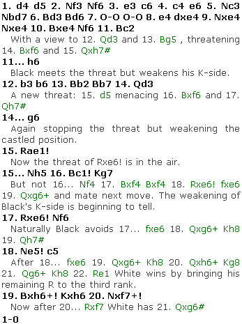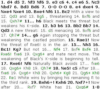 The linebreaks command determines whether or not Palview3 will insert linebreaks into the game section each time a comment to variation appears. This is a new Palview command. With linbreaks, the pages created by Palview appear much like a chess book. But this can be expensive, as far as lost screen space is concerned. Here is an example illustrating both settings: linebreaks = off ![]() linebreaks = on ![]() For most pages we recommend you set linebreaks = off in order to preserve valuable screen space. However, if you use the htmltype = iframe, then you might want to use the setting, linebreaks = on |