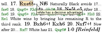 The symtips command is used to provide a tooltip for most chess symbol GIF images. These tooltips define what the symbol means in plain language. When viewers of your page hover their mouse over a GIF chess symbol, they will be shown its meaning. At the moment, all the tooltips for symbols are in English only. Here is an example of a symbol tooltip: ![]() Some chess symbols do not use any GIF images at all. These symbols are generally constructed using a combination of the '!' and '?' characters to indicate good or bad moves. Because these symbols do not have a GIF image, no tooltip is provided for them. One other such symbol is the symbol for equality, or '='. Below is a table of the chess symbols and their associated tooltip: ![]() Note that in order to be able to use these symtips, that you must also have set symbolmethod to gif. For more information on PGN and chess symbols, see the section: Portable Game Notation |